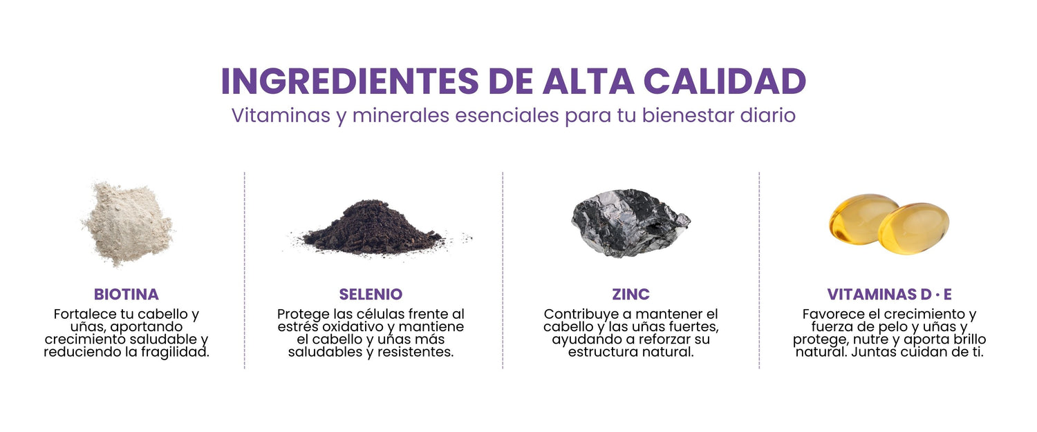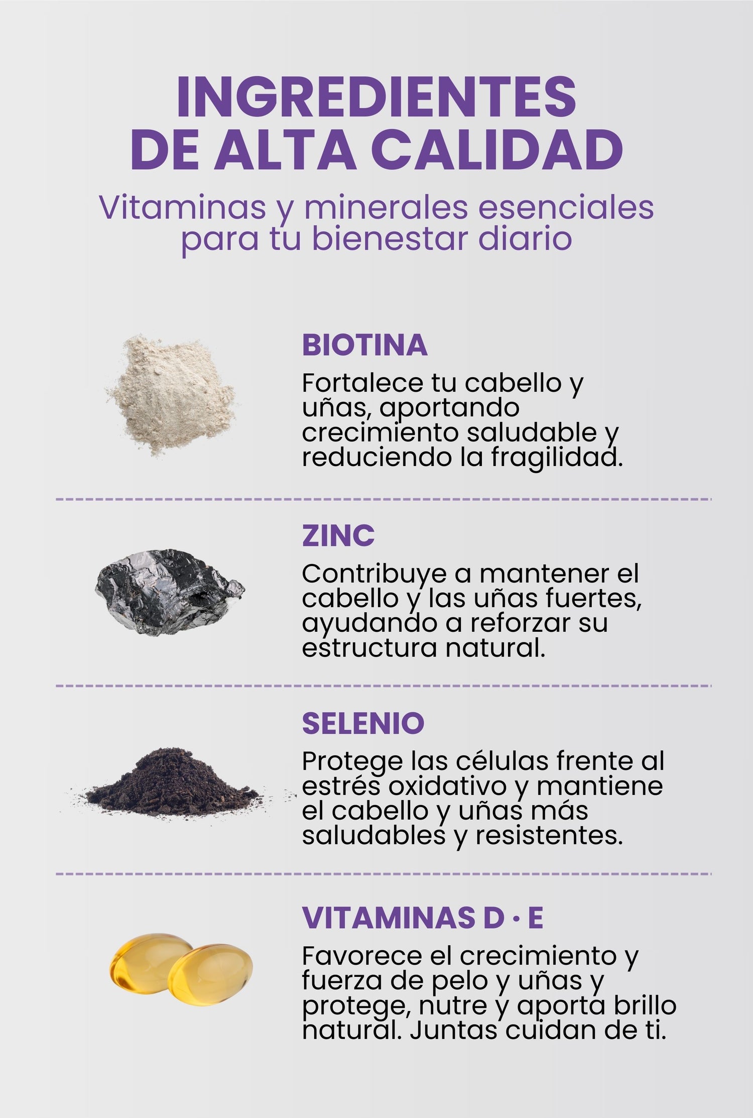 - Zinc (15 mg – 150% VRN): Contribuye al mantenimiento de la piel, cabello y uñas. Apoya el sistema inmunitario y el metabolismo normal.